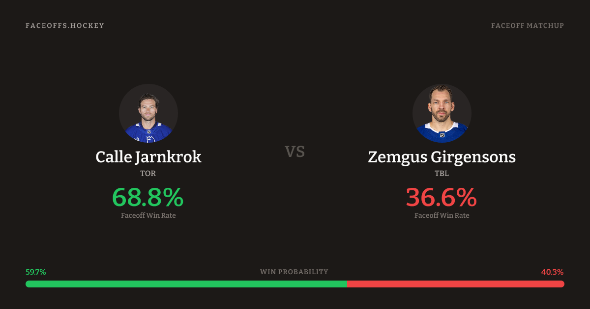 These two are closely matched in overall FO% (45.8% vs 45.7%). Look for Girgensons on neutral-zone draws (75% H2H, 4 meetings). Jarnkrok wins 46.4% vs left-shot opponents — Girgensons shoots left.