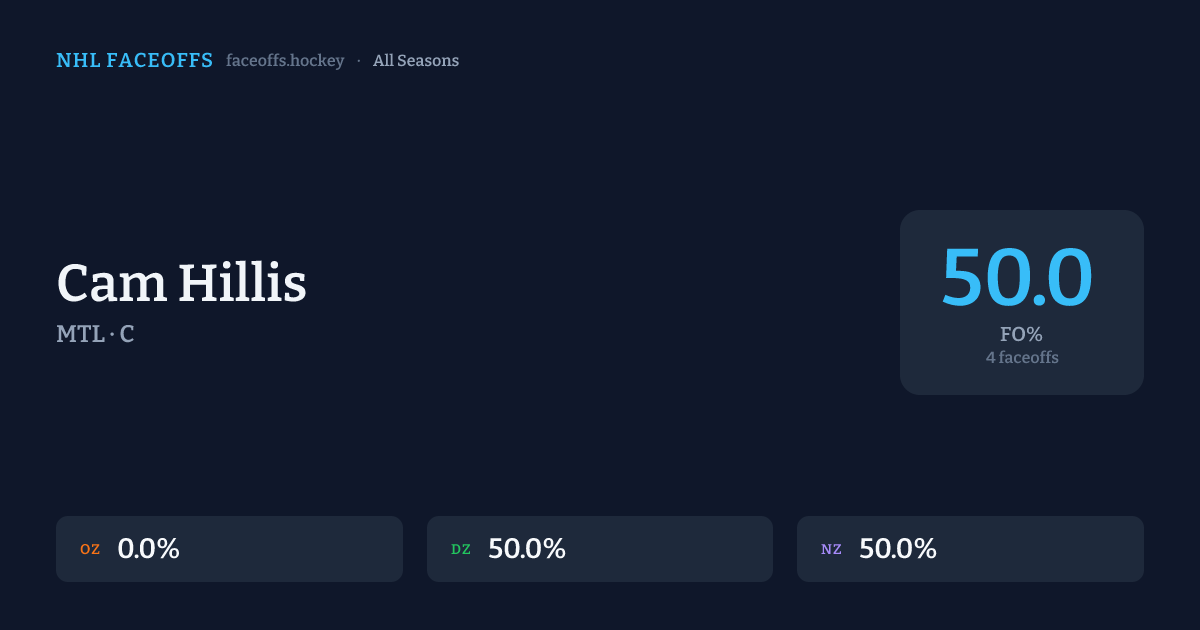 Cam Hillis has a career faceoff win percentage of 50.0% across 4 faceoffs. Best zone: Neutral (50.0%).