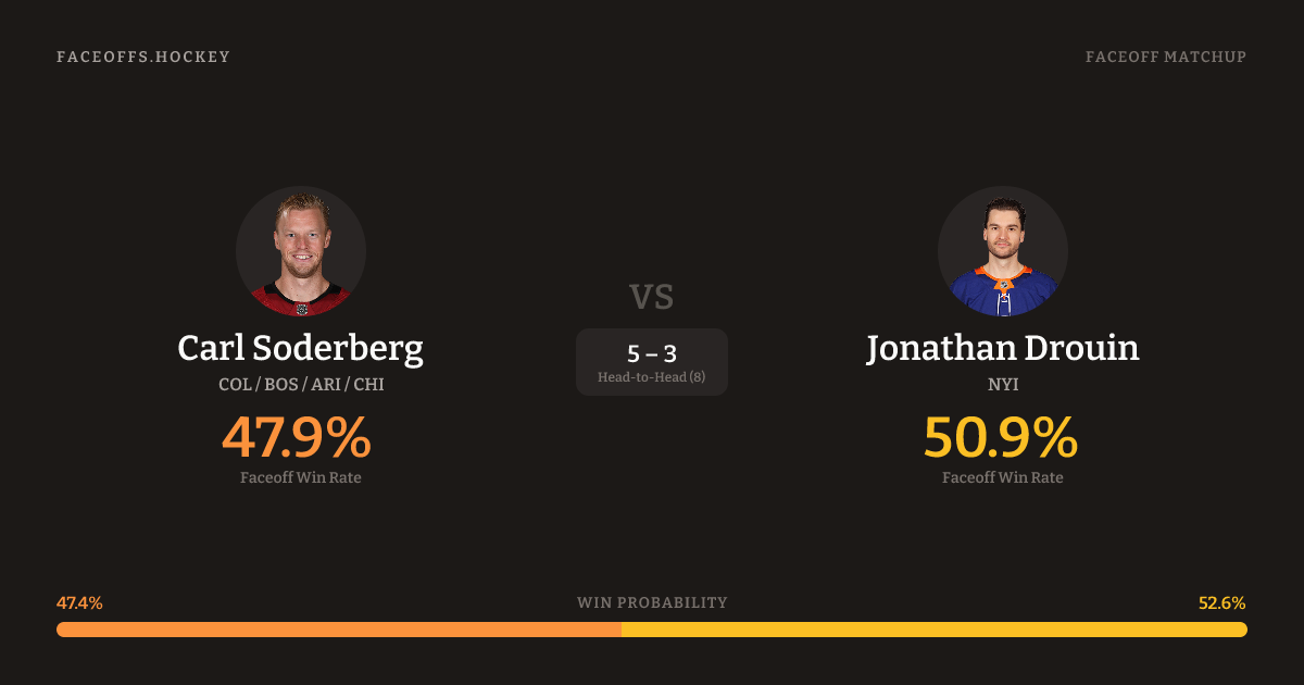 Carl Soderberg holds a +2.8% FO% edge overall. Look for Soderberg on defensive-zone draws (100% H2H, 4 meetings). Soderberg wins 43.8% vs left-shot opponents — Drouin shoots left.