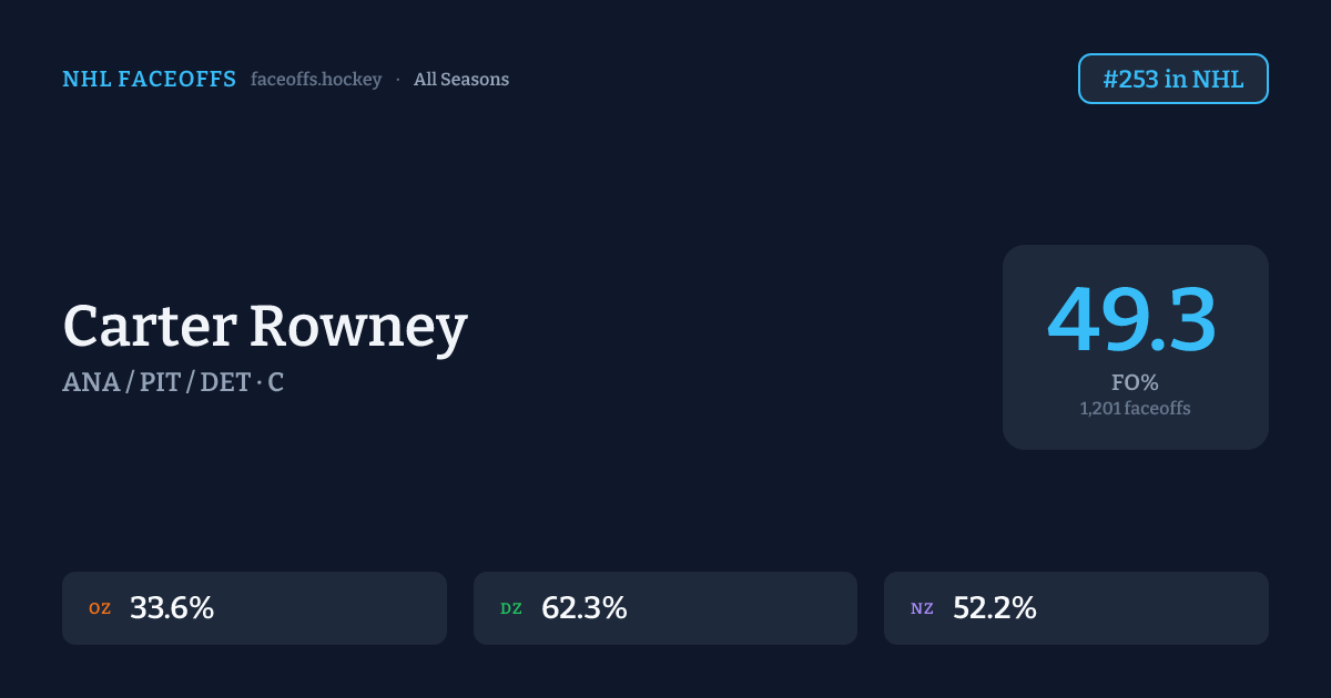 Carter Rowney has a career faceoff win percentage of 49.3% across 1,201 faceoffs. Best zone: Defensive (62.3%). Ranked #253 in the league.