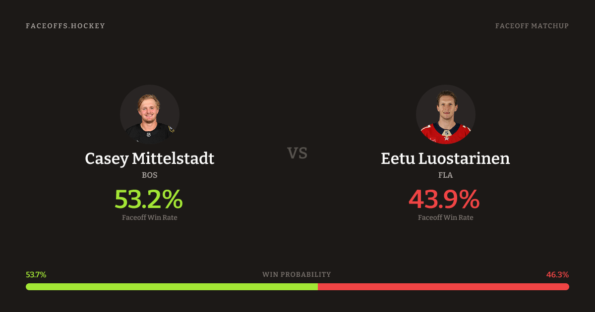 Mittelstadt shoots left. Luostarinen is 39.0% vs left-shot opponents (531).