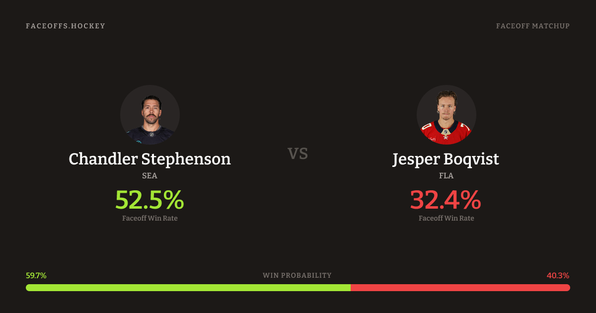 Chandler Stephenson holds a +14.7% FO% edge overall. Look for Boqvist on defensive-zone draws (80% H2H, 5 meetings).