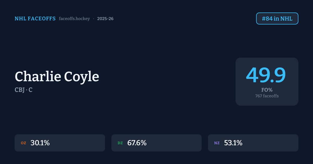 Charlie Coyle has a 2022-23 faceoff win percentage of 53.0% across 1,129 faceoffs in the 2022-23 season. Best zone: Defensive (64.9%). Ranked #49 in the league.