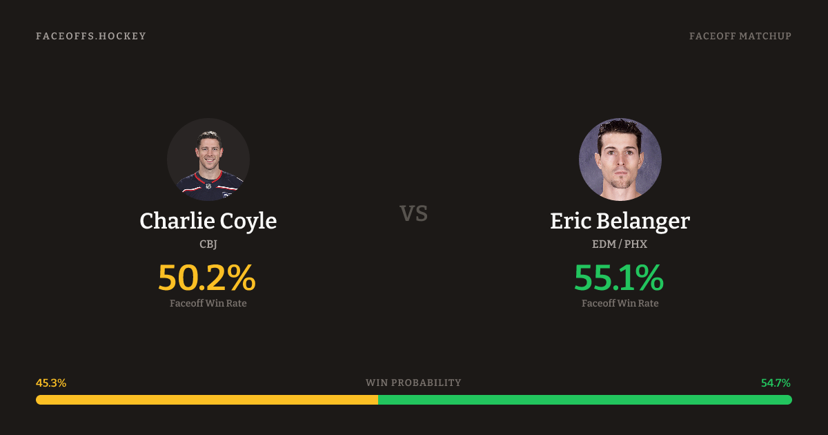 Belanger shoots left. Coyle is 47.9% vs left-shot opponents (6,791).