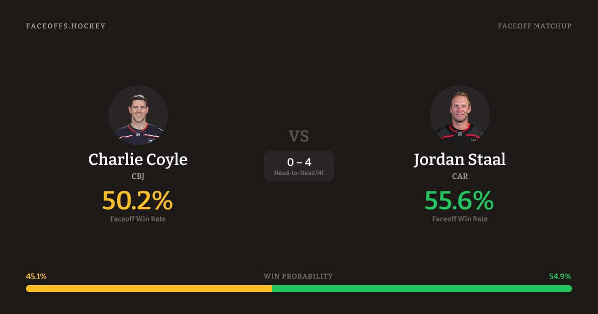 Jordan Staal holds a +6.5% FO% edge overall. Look for Staal on defensive-zone draws (89% H2H, 9 meetings).