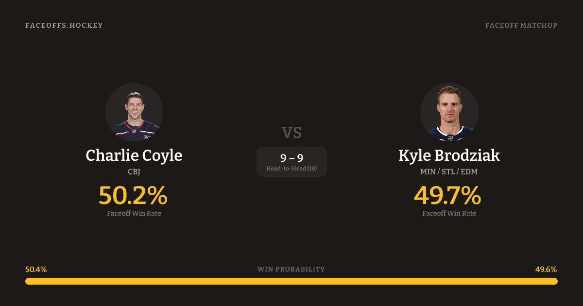 These two are closely matched in overall FO% (52.2% vs 52.1%). Look for Brodziak on neutral-zone draws (67% H2H, 3 meetings).