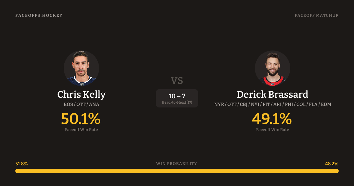 Chris Kelly holds a +1.0% FO% edge overall. Look for Kelly on defensive-zone draws (100% H2H, 5 meetings).