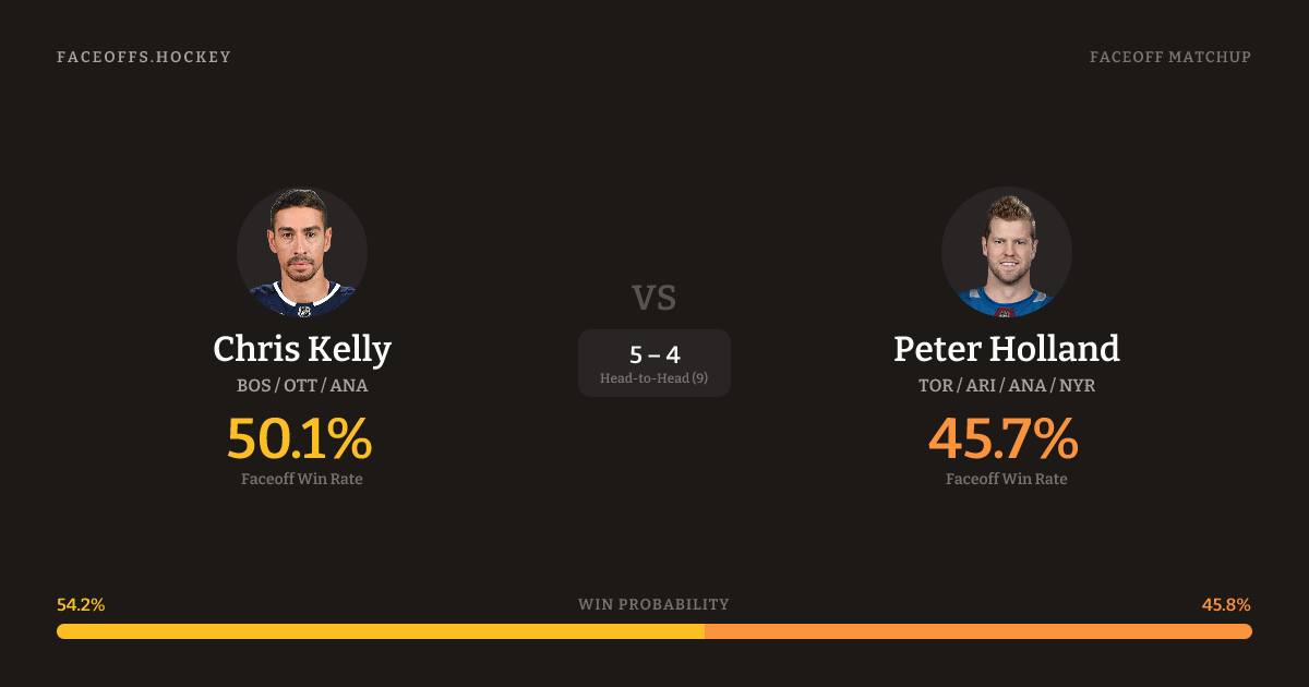 These two are closely matched in overall FO% (44.5% vs 45.4%). Kelly wins 41.5% vs left-shot opponents — Holland shoots left.