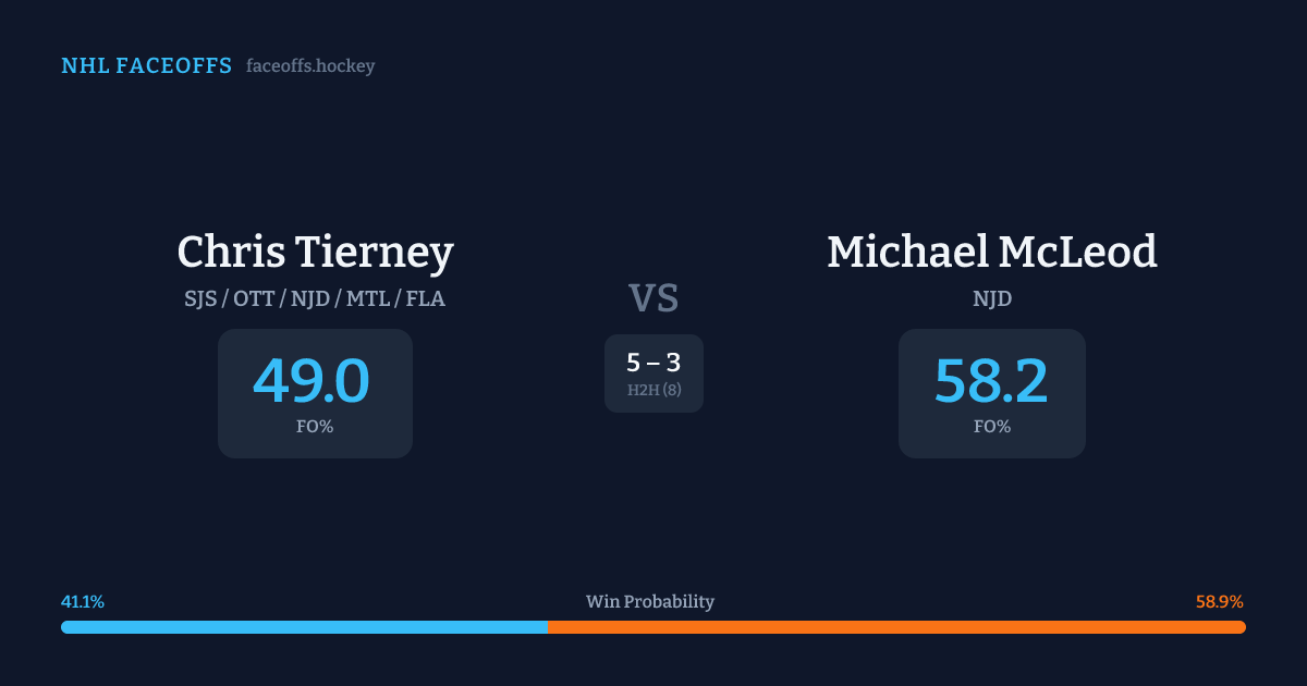 Michael McLeod holds a +13.6% FO% edge overall. Tierney wins 38.6% vs right-shot opponents — McLeod shoots right.