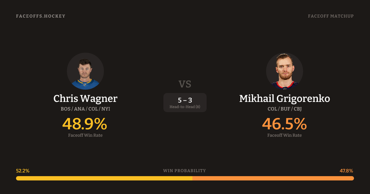 Chris Wagner vs Mikhail Grigorenko — Faceoff Head-to-Head