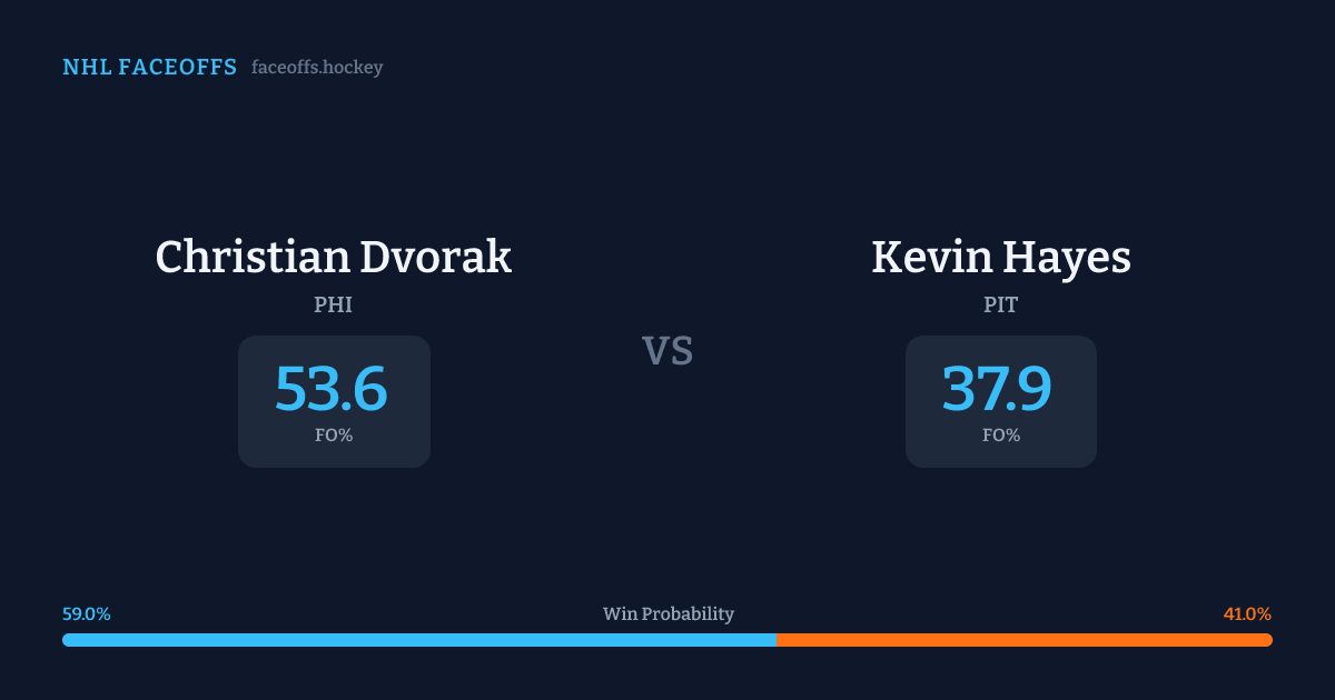 Christian Dvorak holds a +1.1% FO% edge overall. Look for Hayes on neutral-zone draws (75% H2H, 4 meetings). Dvorak wins 46.4% vs left-shot opponents — Hayes shoots left.