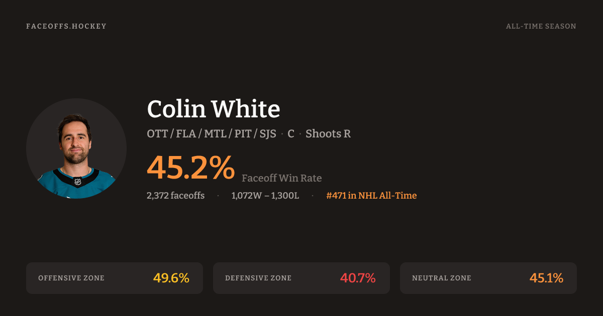 Colin White has a career faceoff win percentage of 45.3% across 2,455 faceoffs. Best zone: Offensive (49.4%). Ranked #466 in the league.