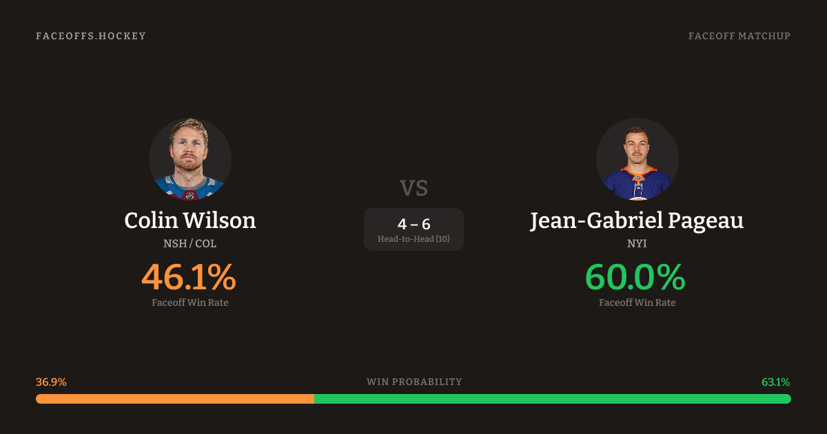 Jean-Gabriel Pageau holds a +12.2% FO% edge overall. Look for Wilson on offensive-zone draws (100% H2H, 4 meetings). Wilson wins 45.5% vs right-shot opponents — Pageau shoots right.