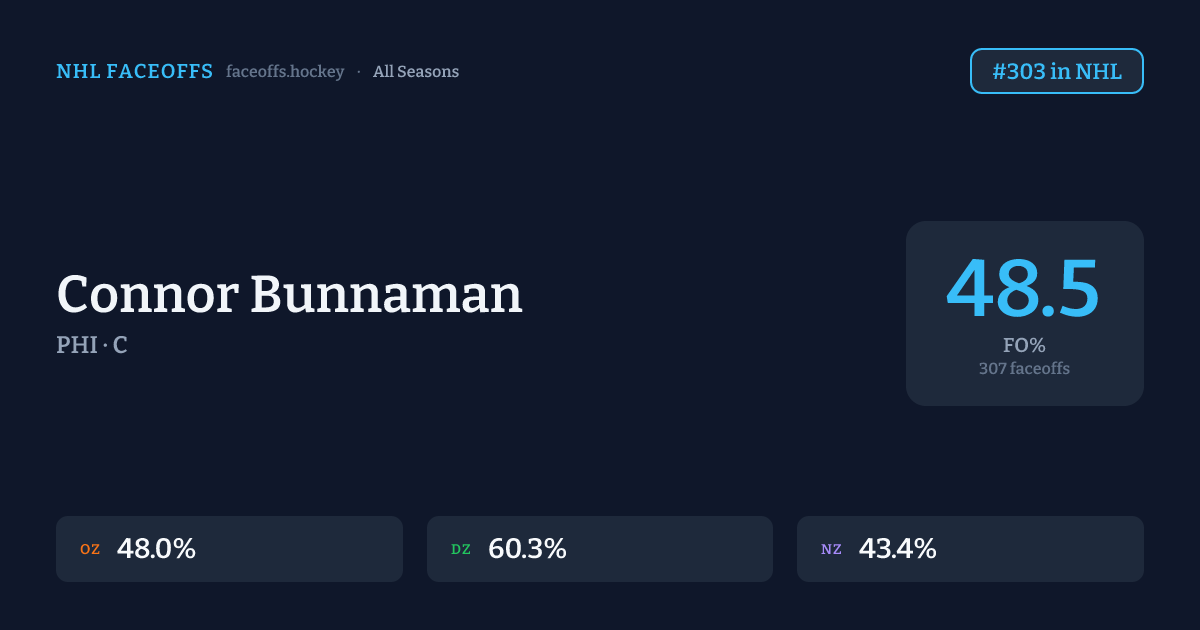 Connor Bunnaman has a career faceoff win percentage of 48.5% across 307 faceoffs. Best zone: Defensive (60.3%). Ranked #303 in the league.