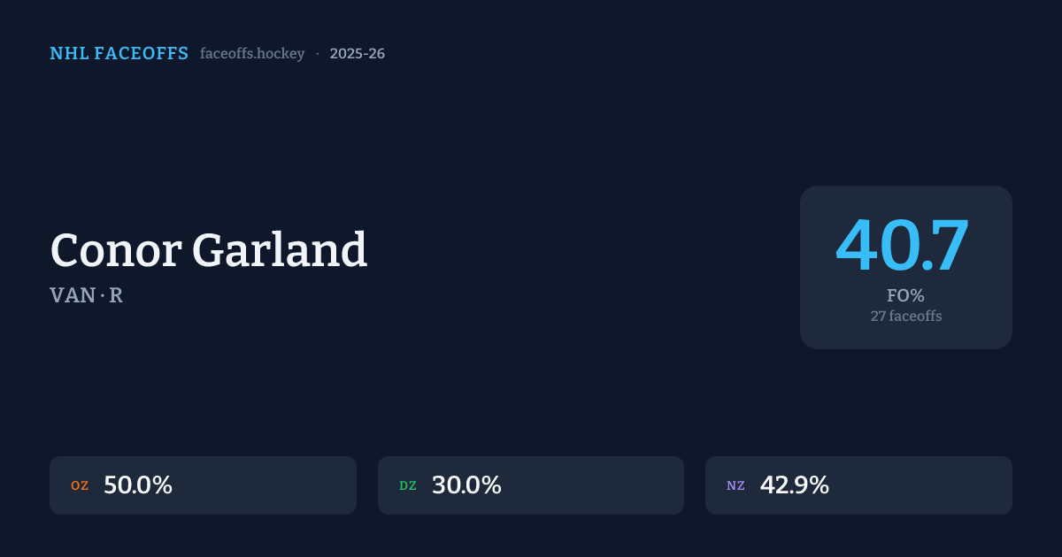 Conor Garland has a 2025-26 faceoff win percentage of 40.7% across 27 faceoffs in the 2025-26 season. Best zone: Offensive (50.0%).
