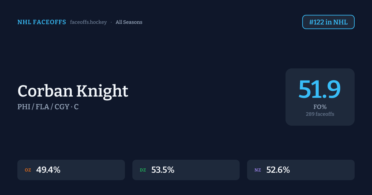 Corban Knight has a career faceoff win percentage of 51.9% across 289 faceoffs. Best zone: Defensive (53.5%). Ranked #122 in the league.
