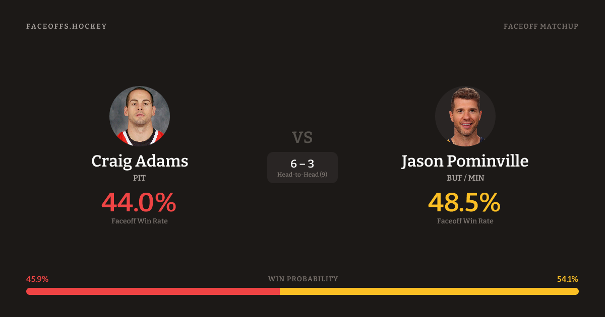 Jason Pominville holds a +1.5% FO% edge overall. Look for Adams on neutral-zone draws (75% H2H, 4 meetings). Adams wins 40.0% vs right-shot opponents — Pominville shoots right.