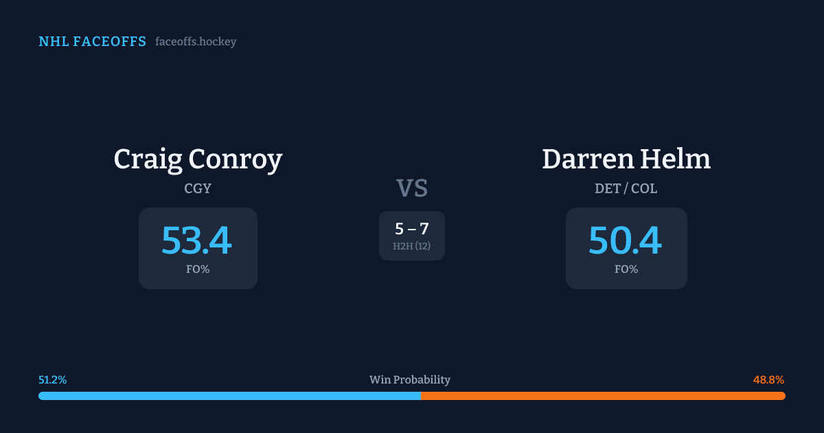 These two are closely matched in overall FO% (53.4% vs 52.6%). Look for Conroy on offensive-zone draws (100% H2H, 3 meetings). Conroy wins 53.8% vs left-shot opponents — Helm shoots left.