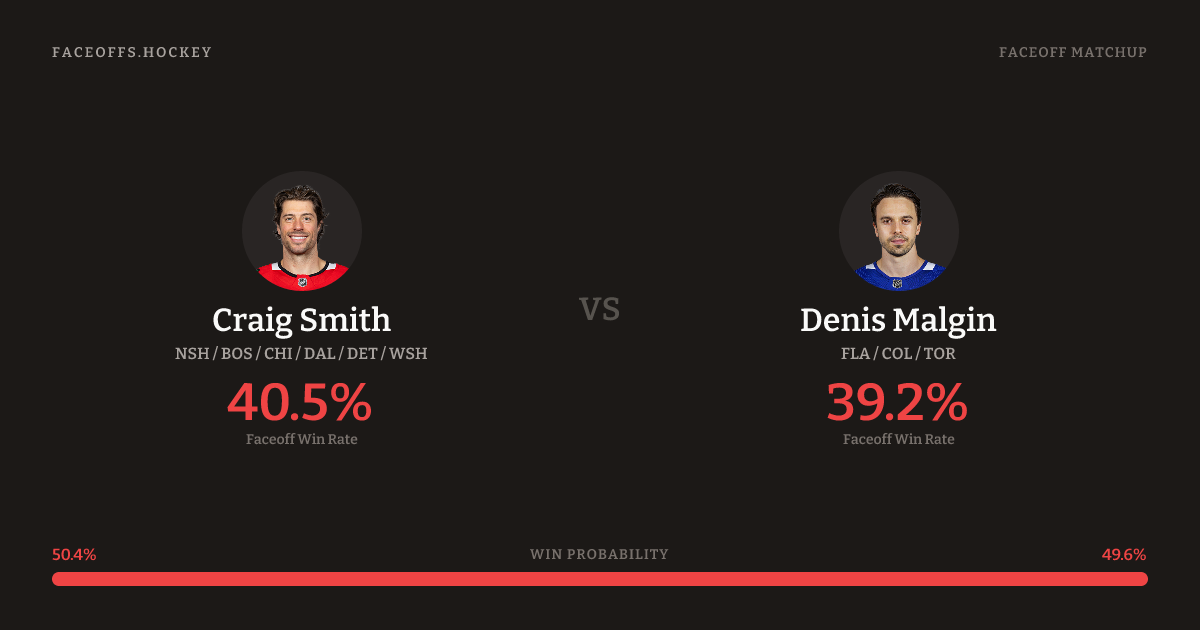 Craig Smith holds a +1.3% FO% edge overall. Smith wins 45.0% vs right-shot opponents — Malgin shoots right.