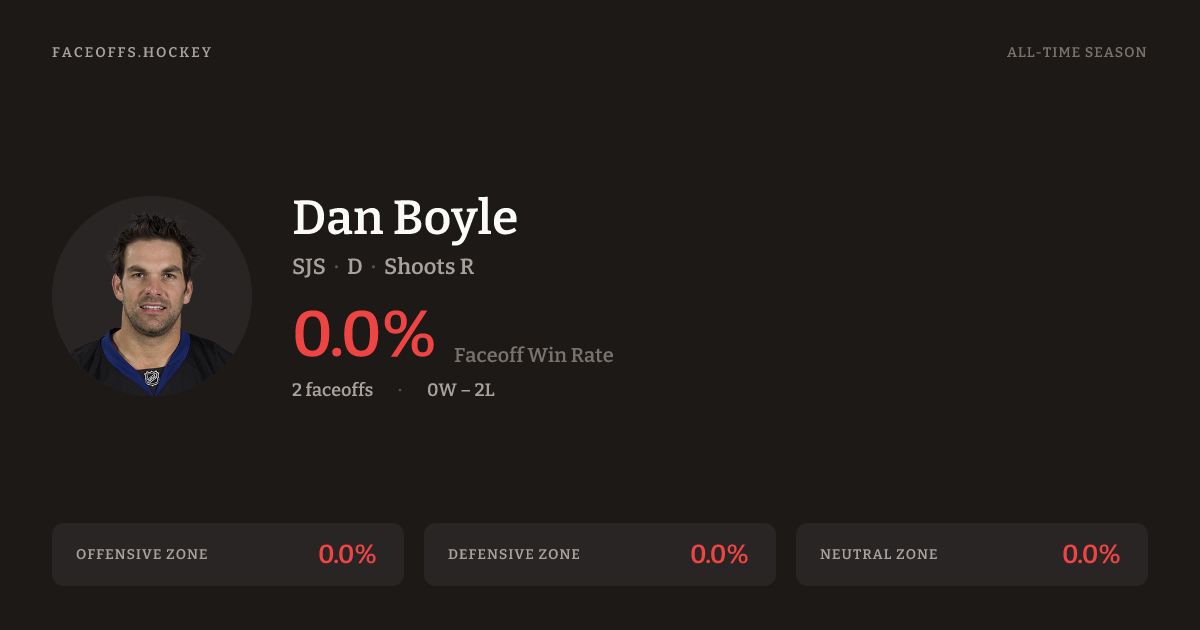 Dan Boyle has a career faceoff win percentage of 0.0% across 2 faceoffs. Best zone: Neutral (0.0%).