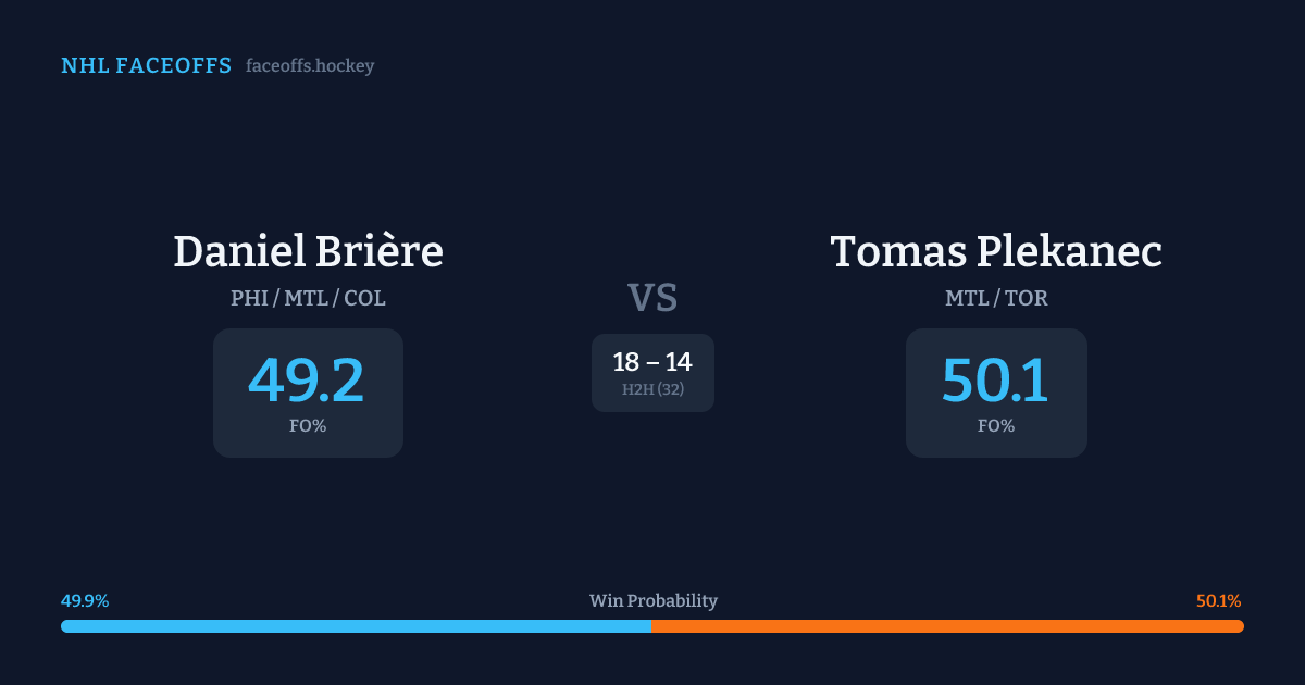Tomas Plekanec holds a +1.6% FO% edge overall. Look for Brière on offensive-zone draws (91% H2H, 11 meetings).