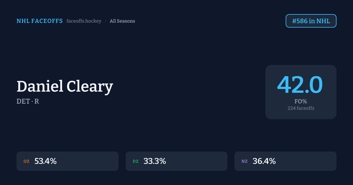 Daniel Cleary has a career faceoff win percentage of 42.0% across 224 faceoffs. Best zone: Offensive (53.4%). Ranked #586 in the league.