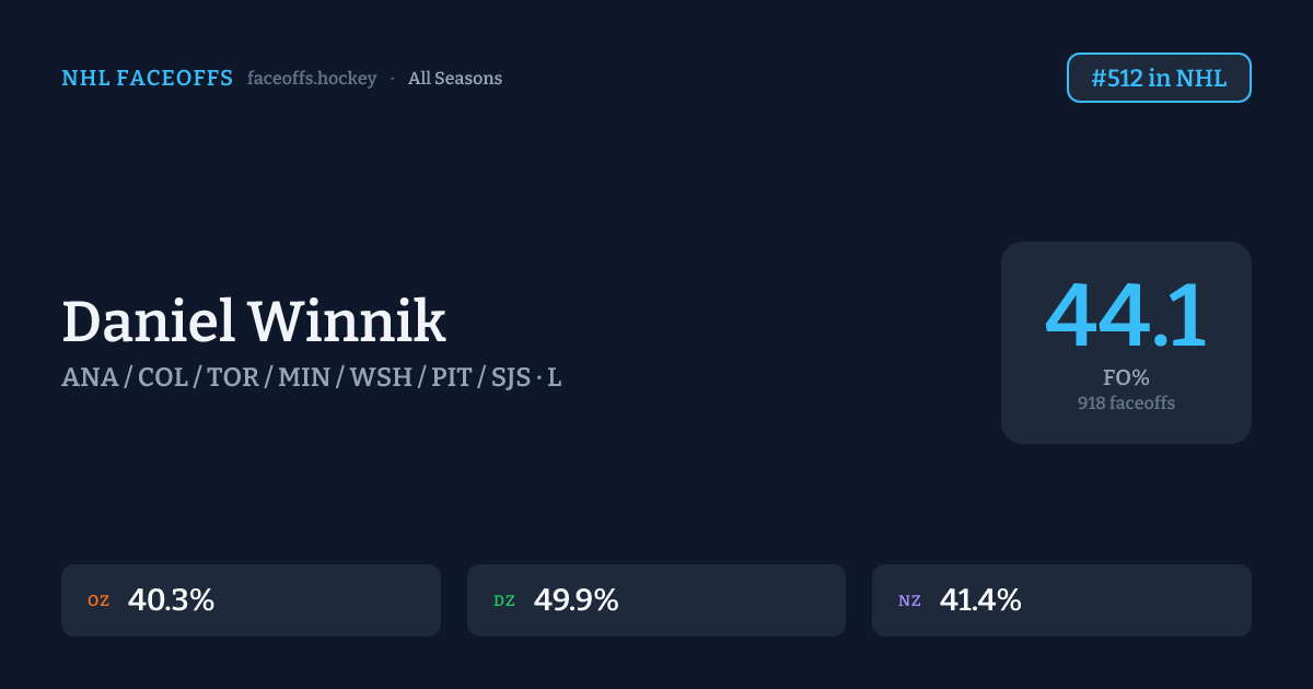 Daniel Winnik has a career faceoff win percentage of 44.1% across 918 faceoffs. Best zone: Defensive (49.9%). Ranked #512 in the league.