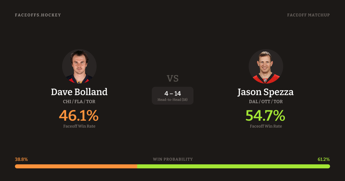 Jason Spezza holds a +9.1% FO% edge overall. Look for Spezza on neutral-zone draws (100% H2H, 4 meetings). Bolland wins 42.1% vs right-shot opponents — Spezza shoots right.