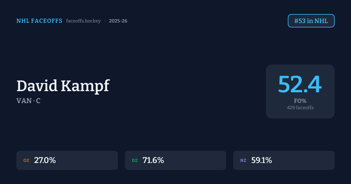 David Kampf has a 2025-26 faceoff win percentage of 52.4% across 429 faceoffs in the 2025-26 season. Best zone: Defensive (71.6%). Ranked #53 in the league.