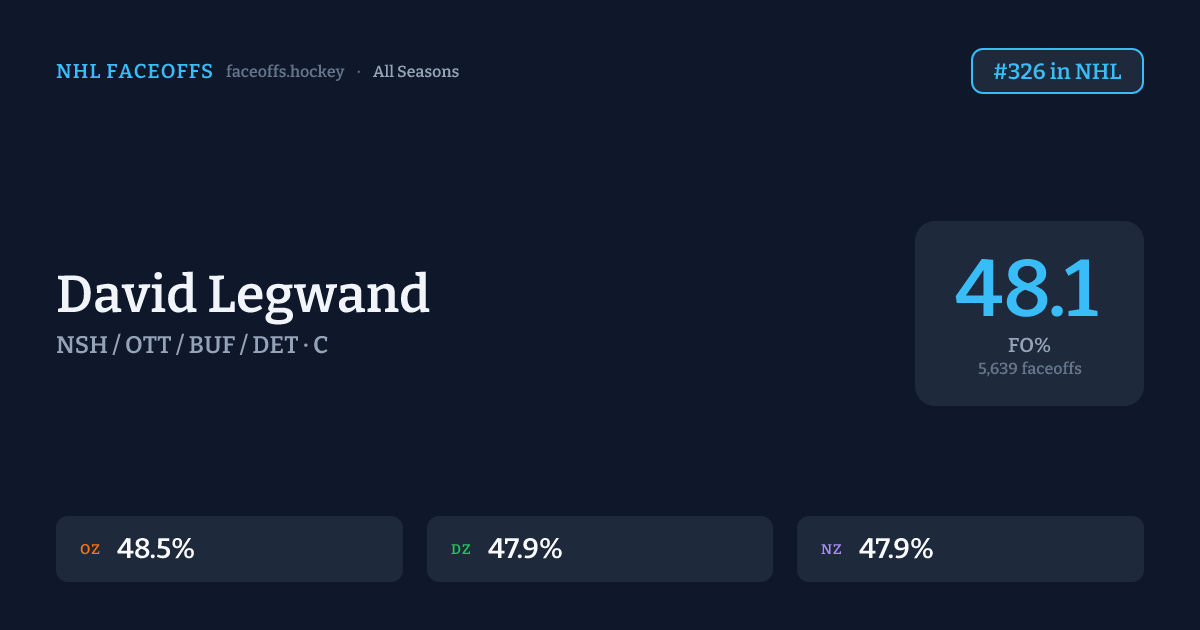 David Legwand has a career faceoff win percentage of 48.1% across 5,639 faceoffs. Best zone: Offensive (48.5%). Ranked #326 in the league.