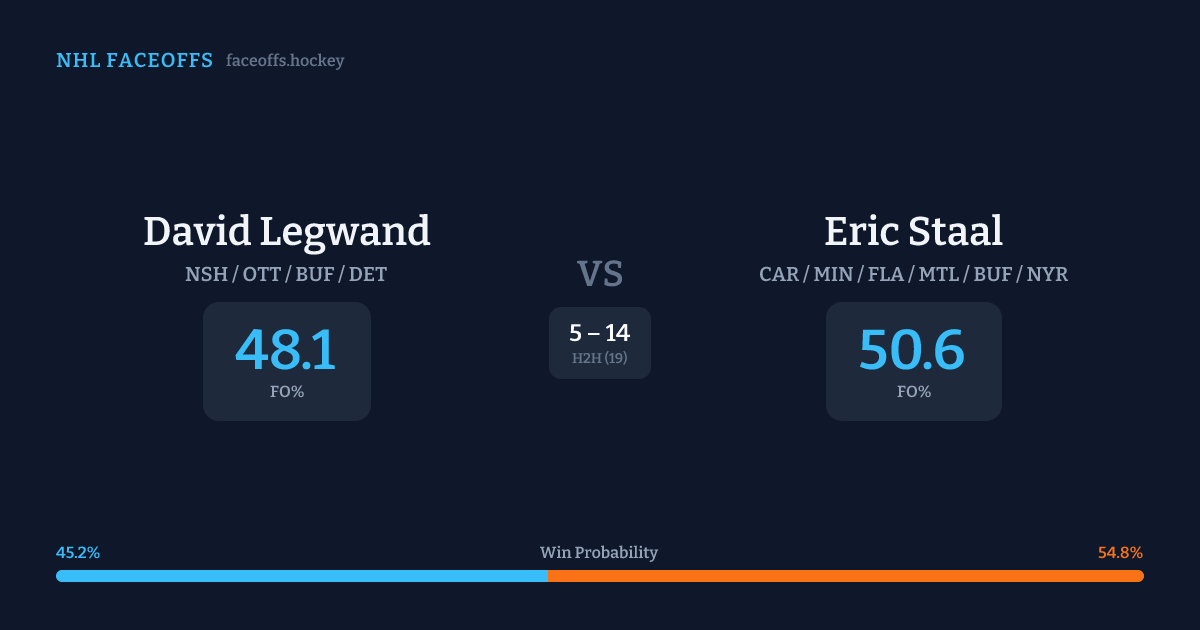 Eric Staal holds a +6.3% FO% edge overall. Look for Staal on offensive-zone draws (100% H2H, 4 meetings). Legwand wins 45.1% vs left-shot opponents — Staal shoots left.