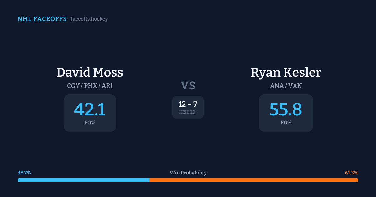 Ryan Kesler holds a +14.3% FO% edge overall. Look for Moss on defensive-zone draws (67% H2H, 6 meetings). Moss wins 44.6% vs right-shot opponents — Kesler shoots right.