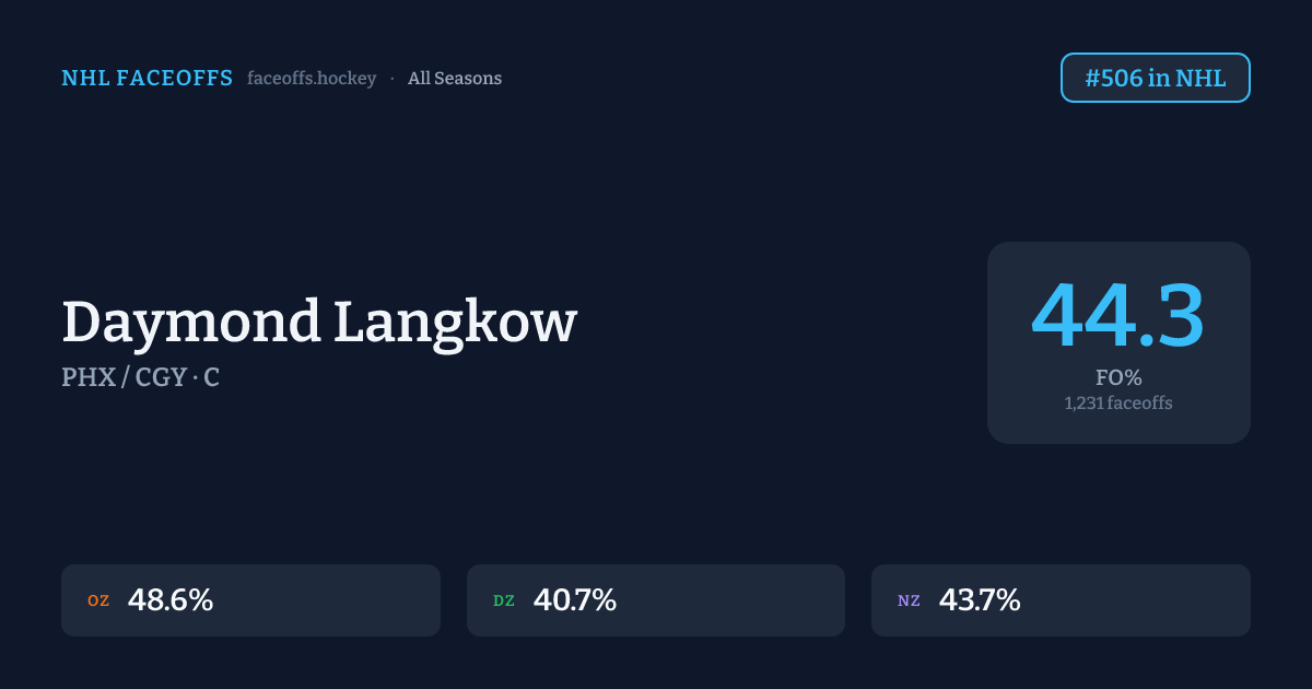 Daymond Langkow has a career faceoff win percentage of 44.3% across 1,231 faceoffs. Best zone: Offensive (48.6%). Ranked #506 in the league.