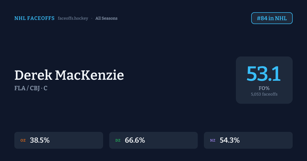 Derek MacKenzie has a career faceoff win percentage of 53.1% across 5,053 faceoffs. Best zone: Defensive (66.6%). Ranked #84 in the league.