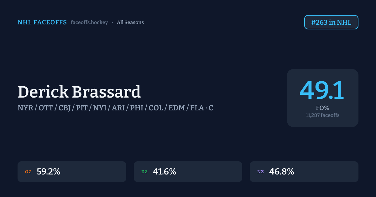 Derick Brassard has a career faceoff win percentage of 49.1% across 11,287 faceoffs. Best zone: Offensive (59.2%). Ranked #263 in the league.