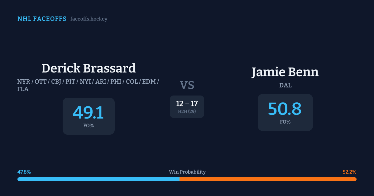 Jamie Benn holds a +1.1% FO% edge overall. Look for Benn on neutral-zone draws (83% H2H, 6 meetings). Brassard wins 44.8% vs left-shot opponents — Benn shoots left.