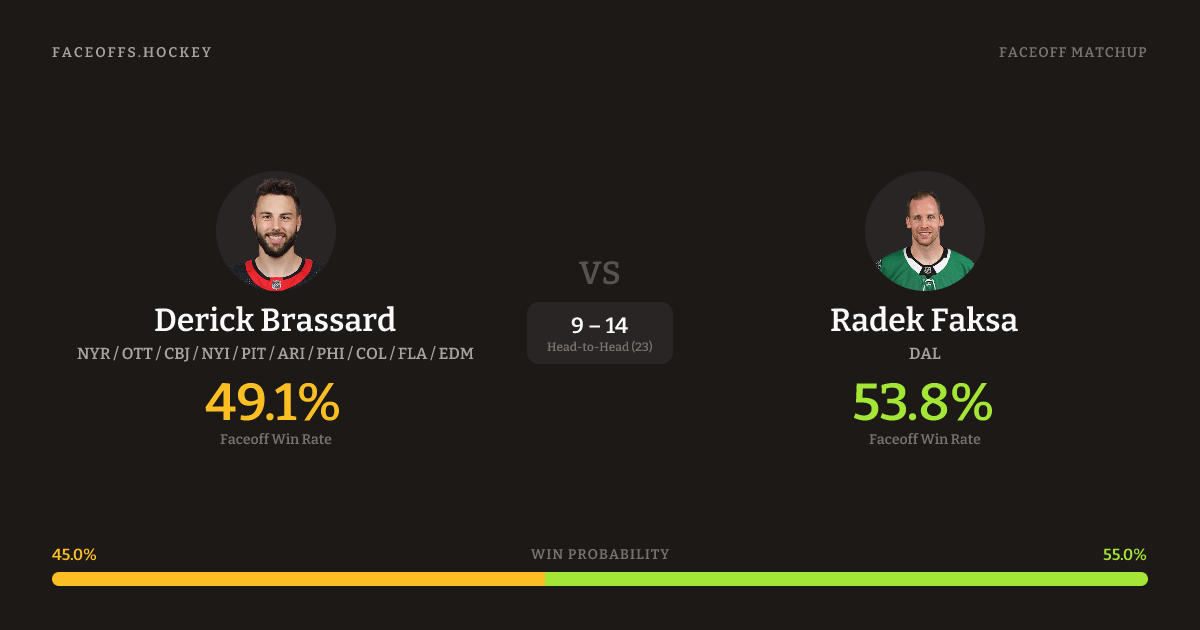 Derick Brassard holds a +5.3% FO% edge overall. Look for Faksa on defensive-zone draws (67% H2H, 3 meetings). Brassard wins 59.5% vs left-shot opponents — Faksa shoots left.