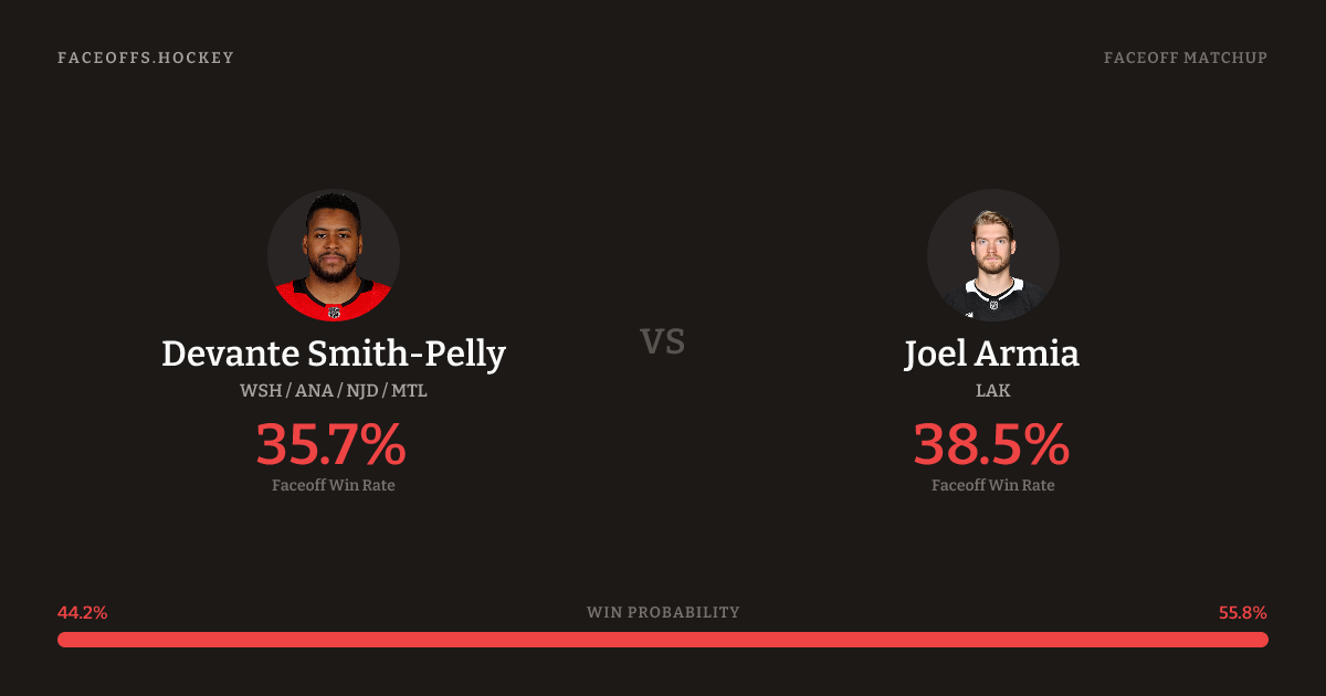 Devante Smith-Pelly holds a +4.8% FO% edge overall. Smith-Pelly wins 35.9% vs right-shot opponents — Armia shoots right.