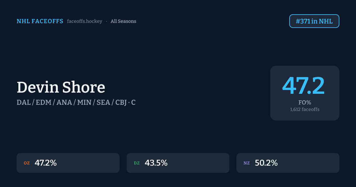Devin Shore has a career faceoff win percentage of 47.2% across 1,612 faceoffs. Best zone: Neutral (50.2%). Ranked #371 in the league.