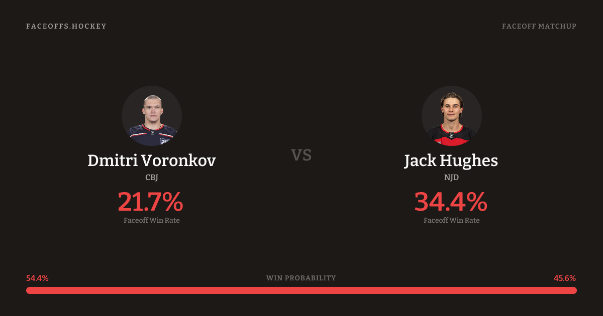 Dmitri Voronkov holds a +5.0% FO% edge overall. Look for Voronkov on neutral-zone draws (100% H2H, 3 meetings). Voronkov wins 45.0% vs left-shot opponents — Hughes shoots left.