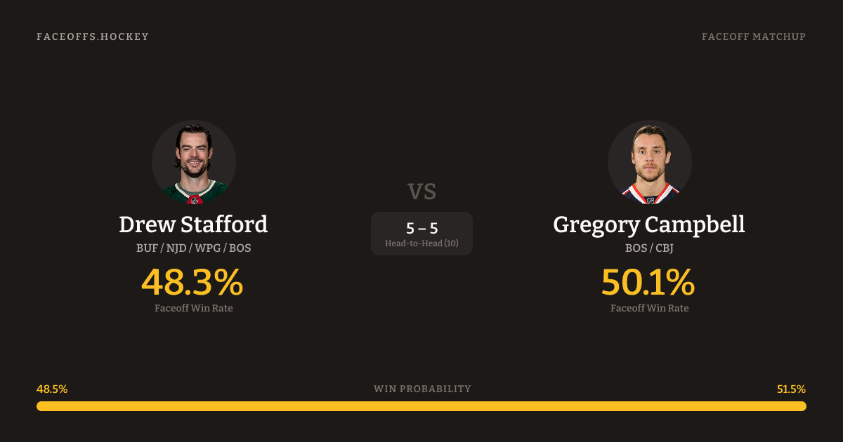 Drew Stafford holds a +6.0% FO% edge overall. Look for Campbell on defensive-zone draws (75% H2H, 4 meetings). Stafford wins 55.3% vs left-shot opponents — Campbell shoots left.