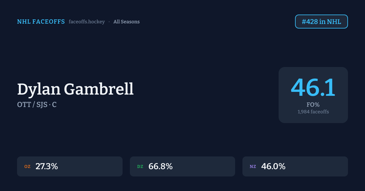 Dylan Gambrell has a career faceoff win percentage of 46.1% across 1,984 faceoffs. Best zone: Defensive (66.8%). Ranked #428 in the league.