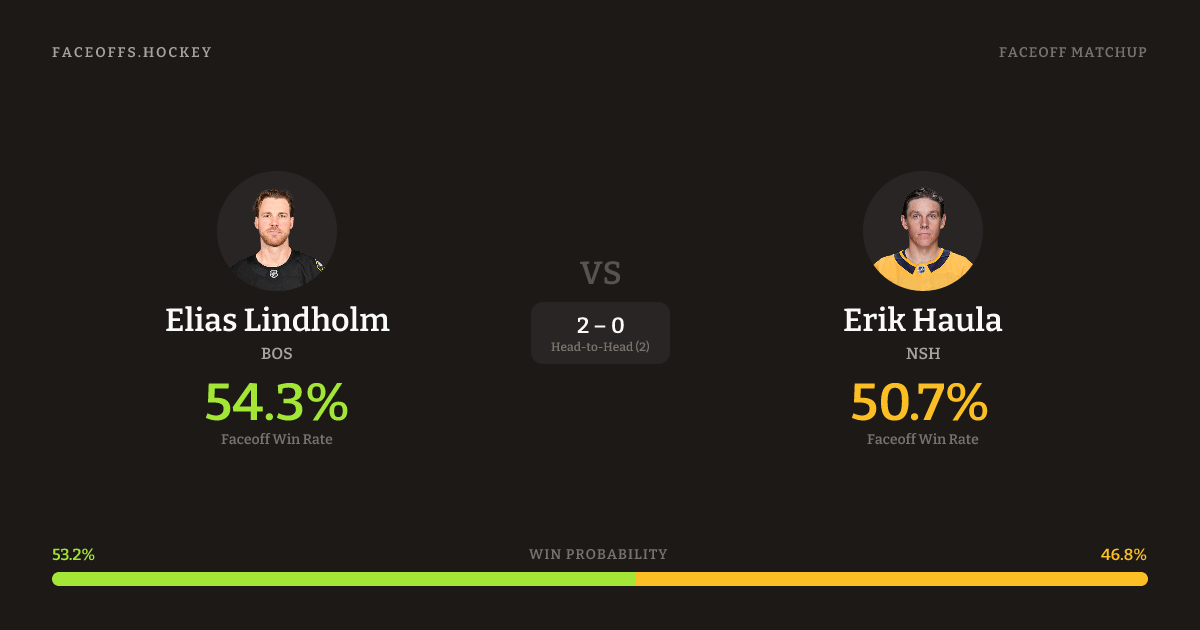 Elias Lindholm holds a +1.6% FO% edge overall. Look for Haula on neutral-zone draws (75% H2H, 4 meetings). Lindholm wins 56.9% vs left-shot opponents — Haula shoots left.