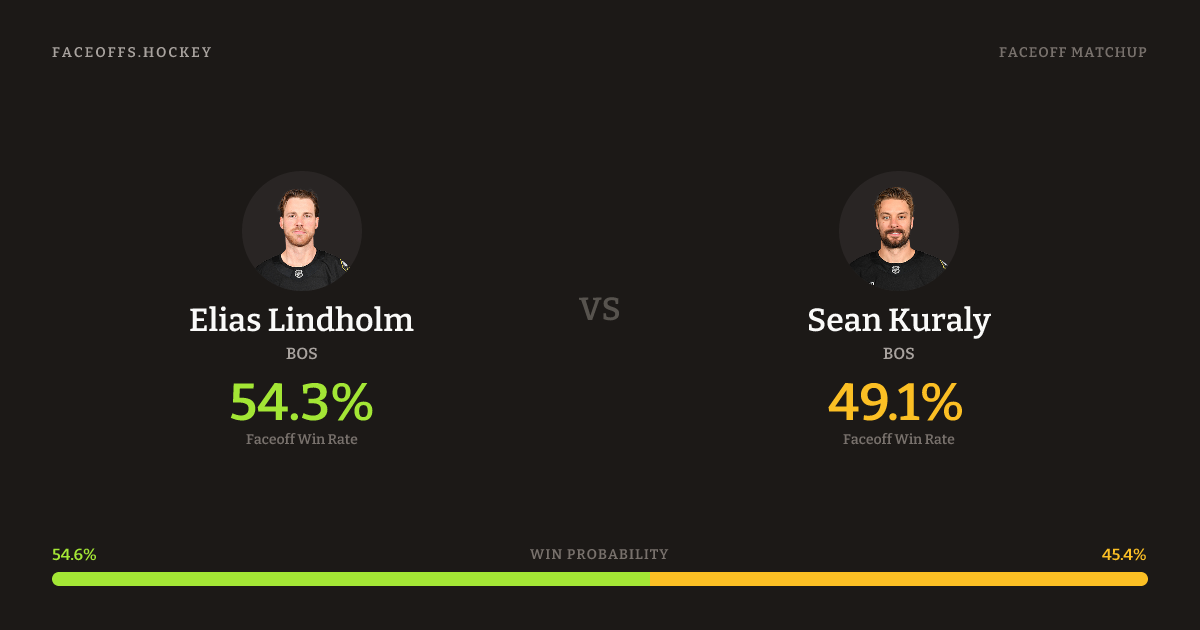 Elias Lindholm holds a +6.1% FO% edge overall. Look for Kuraly on defensive-zone draws (88% H2H, 8 meetings). Lindholm wins 57.6% vs left-shot opponents — Kuraly shoots left.
