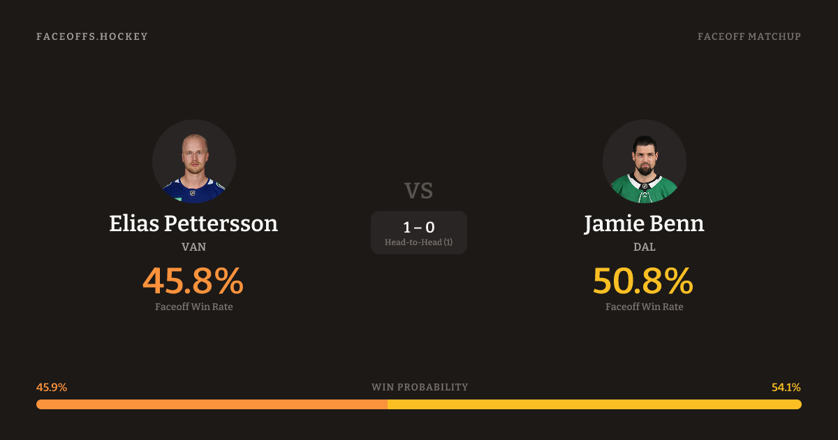 Jamie Benn holds a +10.4% FO% edge overall. Look for Pettersson on offensive-zone draws (67% H2H, 3 meetings).