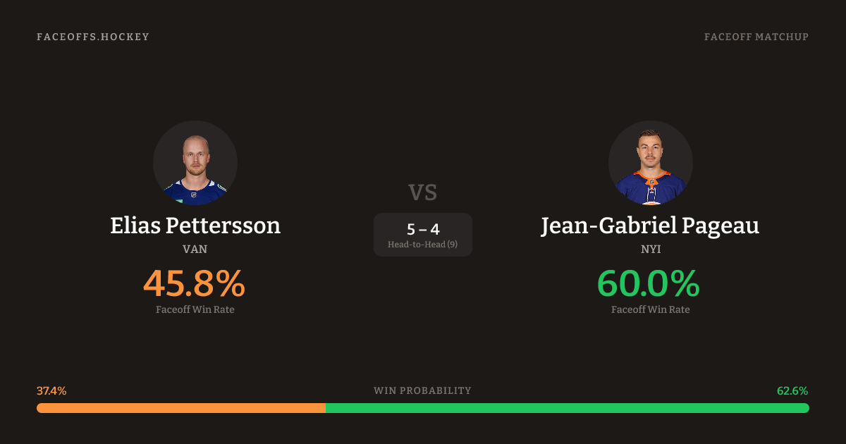 Jean-Gabriel Pageau holds a +11.2% FO% edge overall. Pettersson wins 38.5% vs right-shot opponents — Pageau shoots right.