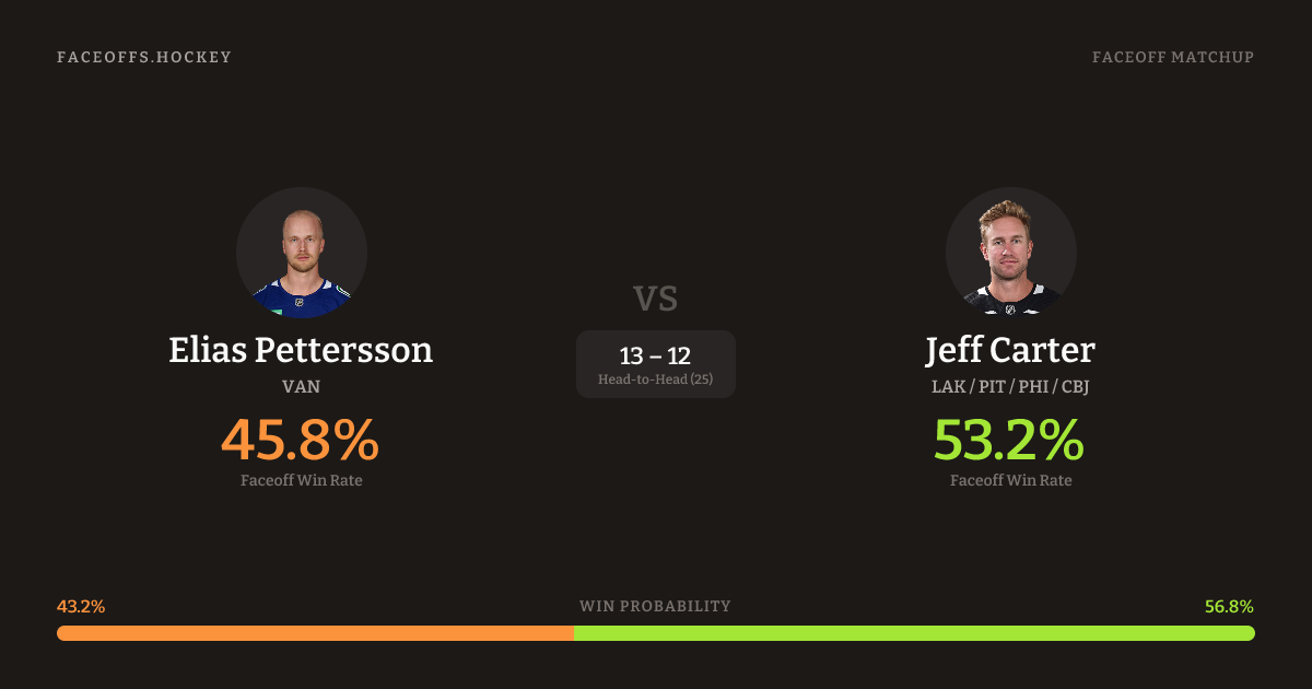Jeff Carter holds a +12.9% FO% edge overall. Look for Pettersson on offensive-zone draws (100% H2H, 3 meetings). Pettersson wins 38.5% vs right-shot opponents — Carter shoots right.