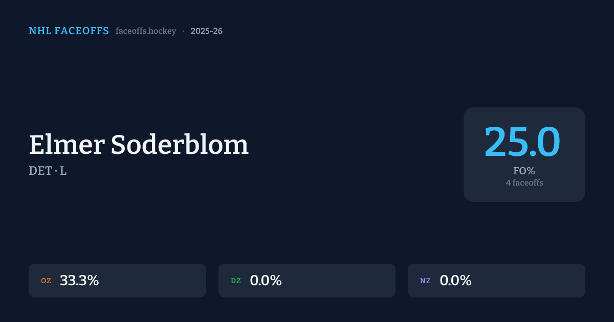Elmer Soderblom has a 2022-23 faceoff win percentage of 25.0% across 4 faceoffs in the 2022-23 season. Best zone: Offensive (100.0%).