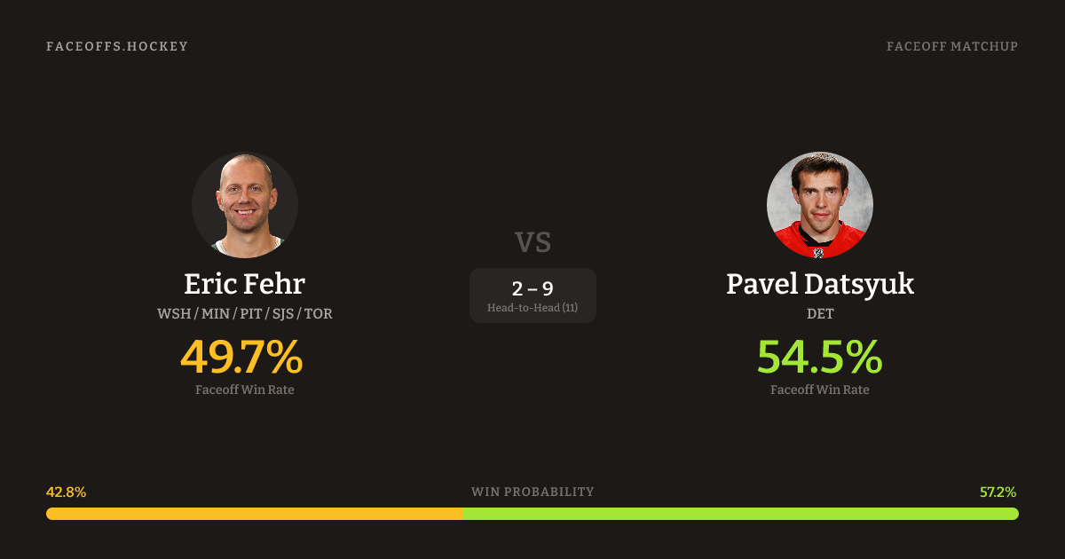Pavel Datsyuk holds a +1.6% FO% edge overall. Look for Datsyuk on neutral-zone draws (86% H2H, 7 meetings). Fehr wins 54.9% vs left-shot opponents — Datsyuk shoots left.