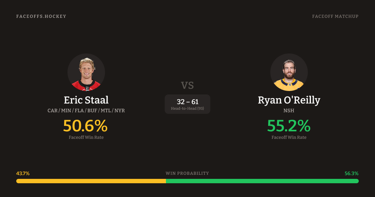 O'Reilly shoots left. Staal is 50.1% vs left-shot opponents (714).
